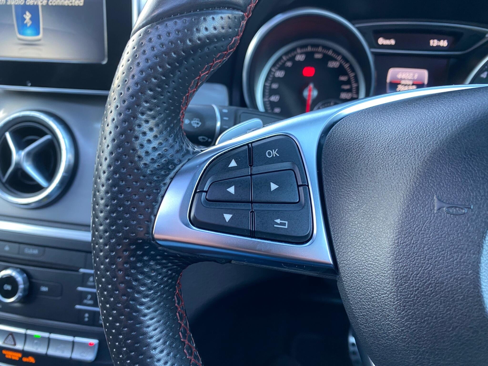 - Steering wheel - 3-spoke 12-button Multi-function Sports Steering Wheel in Leather with Perforated in Grip Area - Flattened Bottom Section and Red Contrast Stitching